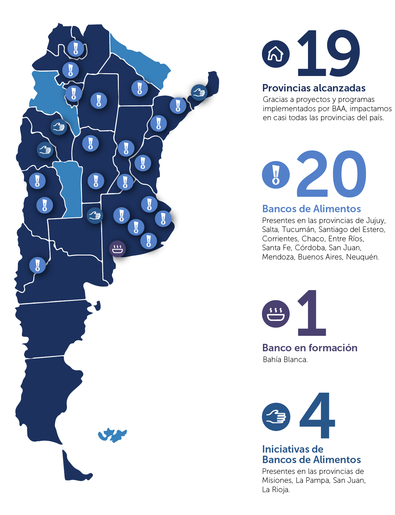 Somos una asociación civil sin fines de lucro que agrupa a los Bancos de Alimentos del país. Trabajamos para reducir el hambre y la malnutrición en Argentina mediante el fortalecimiento de los Bancos de Alimentos y la generación de alianzas estratégicas para promover sistemas alimentarios sostenibles. Mediante el rescate de alimentos y su eficiente distribución generamos platos de comida con valor nutritivo para quienes más lo necesitan.